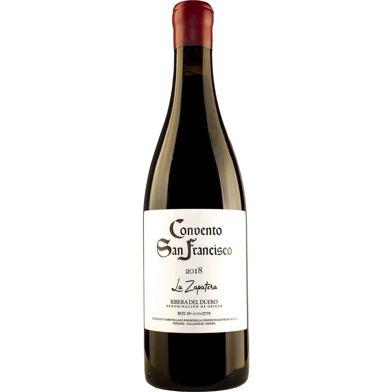 La Zapatera Convento San Francisco- Streek: Ribera del Duero, Spanje- Gebruikte druiven: Voornamelijk Tempranillo- Wijnspijs combinatie: Ideaal bij gegrild rood vlees, Spaanse ham, stoofschotels en rijpe harde kazen.La Zapatera Convento San Francisco is een uitdrukking van de rijke wijnmaaktraditie van Ribera del Duero, een van Spanje's meest geprezen wijnregio's. Deze wijn komt van het wijnhuis Convento San Francisco, bekend om zijn moderne aanpak in de combinatie van traditionele wijnmaaktechnieken met innovatieve methoden. La Zapatera is een lijn die wijnen van hoge kwaliteit produceert met een uitstekende prijs-kwaliteitverhouding, gericht op het uitdrukken van het unieke karakter van de regio en de Tempranillo-druif.De wijn heeft een diepe, donkere robijnrode kleur en onthult complexe aroma's van rijpe zwarte kersen, pruimen en een rijke ondertoon van kruiden en leer. Deze primaire aroma's worden versterkt door elegante tonen van vanille en toast, afkomstig van de rijping in eiken vaten, die diepte en complexiteit toevoegen.In de mond biedt La Zapatera Convento San Francisco een volle body met rijke, goed gestructureerde tannines en een robuuste smaak. De sappige fruitaroma's zijn perfect in balans met de houttonen en de kruidige nuances, wat resulteert in een lange en indrukwekkende afdronk. De wijn heeft een krachtige uitstraling maar behoudt een opmerkelijke finesse, kenmerkend voor de wijnen uit Ribera del Duero.De druiven voor deze wijn worden zorgvuldig geselecteerd uit wijngaarden die bekend staan om hun hoge kwaliteit Tempranillo, wat zorgt voor een expressieve en karaktervolle wijn. De vinificatie en rijping worden met grote zorg uitgevoerd om de natuurlijke kwaliteiten van de druiven te benadrukken en de complexiteit van de wijn te versterken.La Zapatera Convento San Francisco is een uitstekende keuze voor bij een scala aan culinaire gerechten, van gegrild rood vlees en Spaanse ham tot robuuste stoofschotels en rijpe harde kazen. Deze wijn is ideaal voor wie de rijke en krachtige wijnen van Ribera del Duero wil ervaren en is perfect voor speciale gelegenheden of als geschenk voor een wijnliefhebber.Geniet van La Zapatera Convento San Francisco als een prachtige vertegenwoordiging van de Ribera del Duero, waarbij elke slok de passie en het vakmanschap van het wijnhuis Convento San Francisco weerspiegelt.